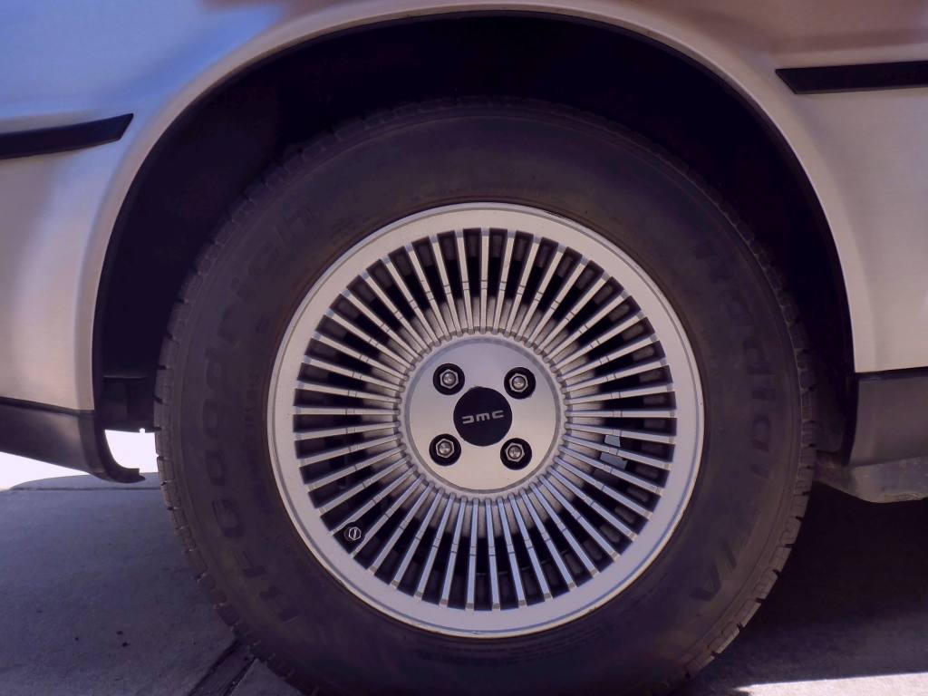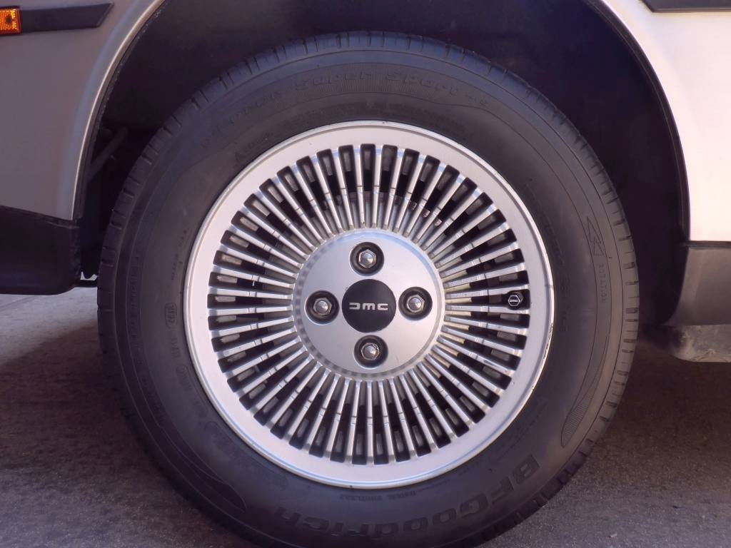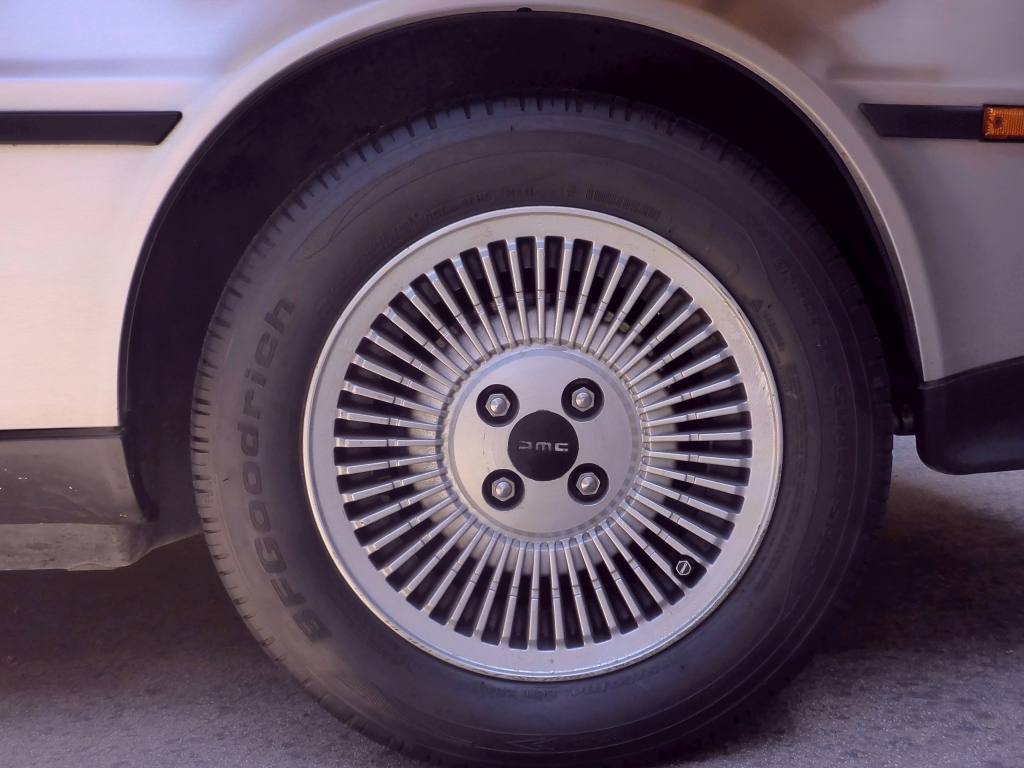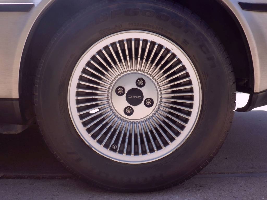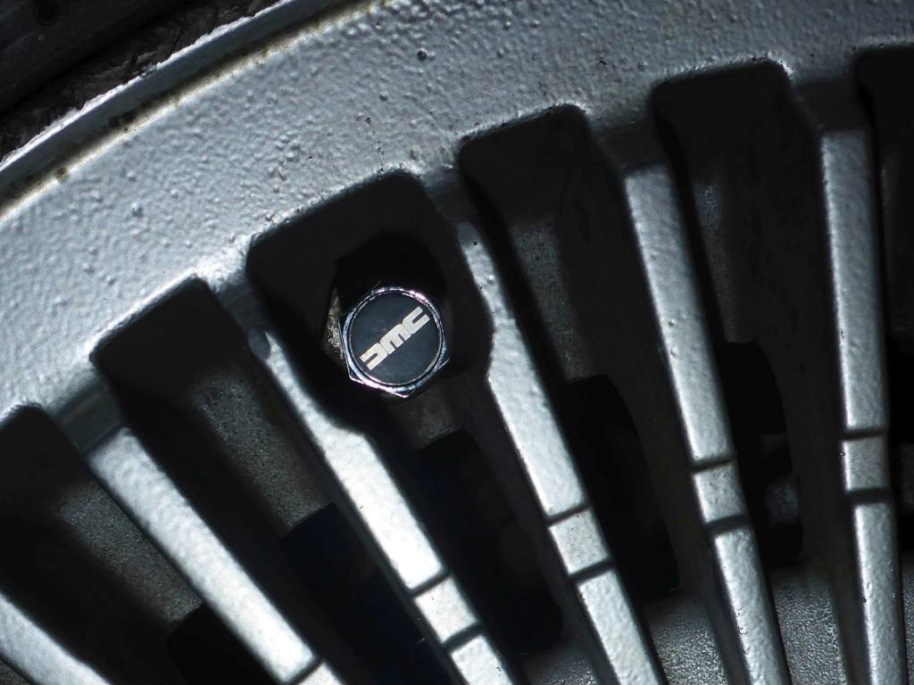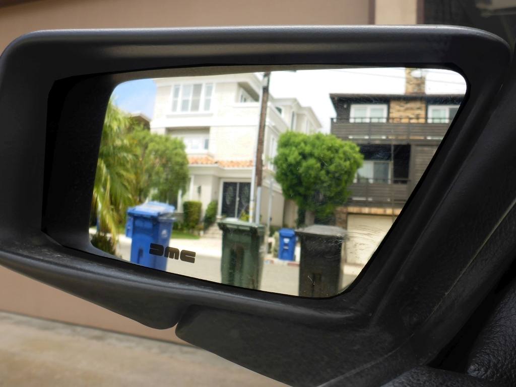 | Narrow view from the standard mirror. | | Wider view from THIS Delorean's mirrors (note the DMC logo). | | Custom DMC valve stem covers! |