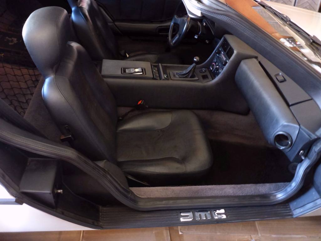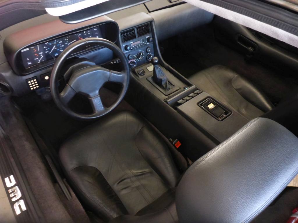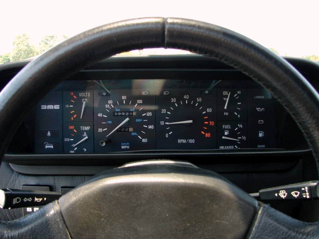 | Well maintained black leather interior. | | Accented DMC door sill logos. | | Fun Fact: In Back to the Future, the car had to go 88 mph for time travel. But the stock DeLorean Spedometer only went to 85. THIS DeLorean's spedomter goes to 160! |